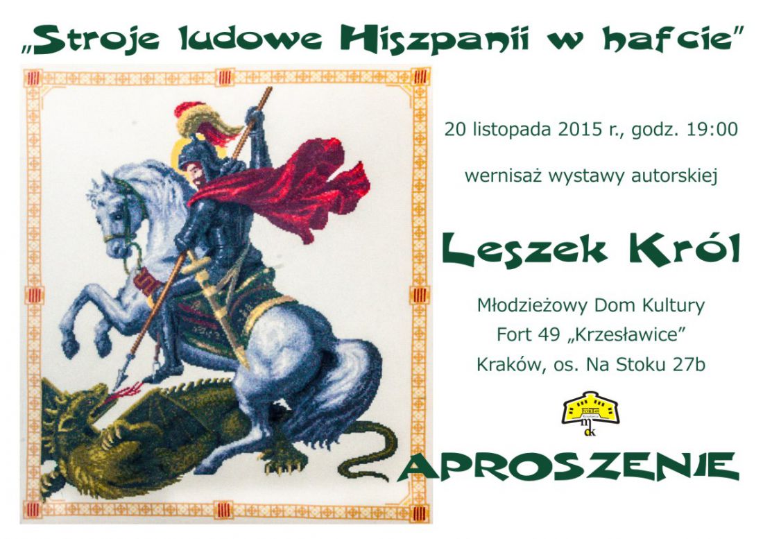 Zapraszamy na wernisaż, który odbędzie się 20 listopada 2015 r., o godz. 19:00. Wystawę będzie można oglšdać w dniach od 20 listopada do 17 grudnia 2015 r., w MDK Fort 49 „Krzesławice” w Krakowie, os. Na Stoku 27b.