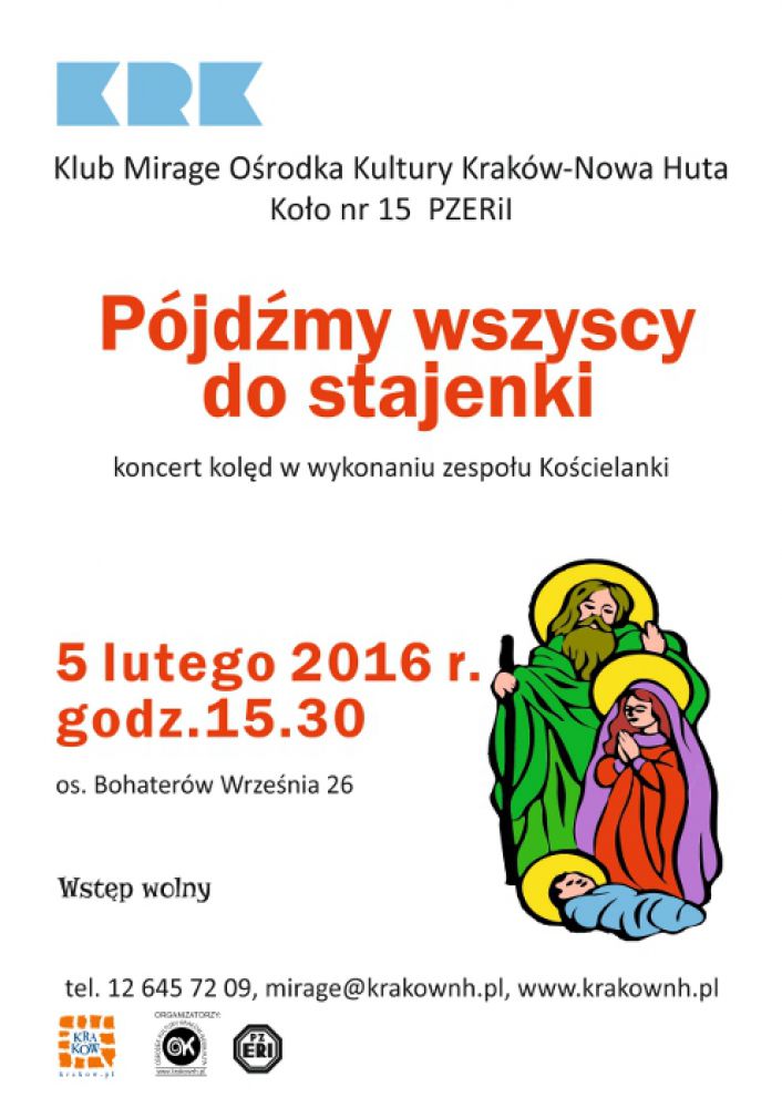 Wspólne kolędowanie to piękna polska tradycja. Kolęda jest niezwykle cennym, bo zawierajšcym proste prawdy utworem, który otwiera nas na tajemnice narodzin Chrystusa. By nie zapomnieć o tej tradycji Klub Mirage Oœrodka Kultury Kraków-Nowa Huta (os. Bohaterów Wrzeœnia 26) wraz z PZERiI zapraszajš na koncert kolęd w wykonaniu zespołu Koœcielanki.