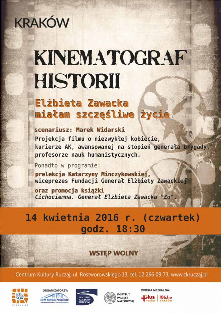 Projekcja filmu o Elżbiecie Zawackiej, kurierze AK, awansowanej na stopień generała brygady, profesorze nauk humanistycznych oraz promocja ksišżki "Cichociemna. Generał Elżbieta Zawacka Zo" autorstwa Katarzyny Minczykowskiej, wiceprezes Fundacji Generał Elżbiety Zawackiej.