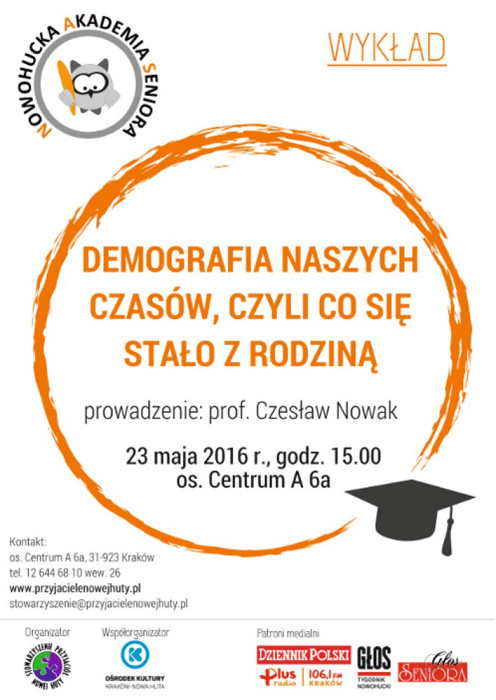Nowohucka Akademia Seniora (os. Centrum A 6a) zaprasza 23 maja na godz. 15.00 na wykład pt. Co się stało z rodzinš?. Wykład poœwięcony będzie zagadnieniom dotyczšcym współczesnych zmian demograficznych. Prowadzšcy wykład, prof. Czesław Nowak, opowie o powodach, dla których zmieniajš się modele rodziny i o paradoksach rzšdzšcych wskaŸnikami wzrostu liczby ludnoœci. Usłyszeć także będzie można o zmianie stylu życia i zmianach zachodzšcych na rynku żywnoœci, które również wywierajš wpływ na współczesne przeobrażenia demograficzne.