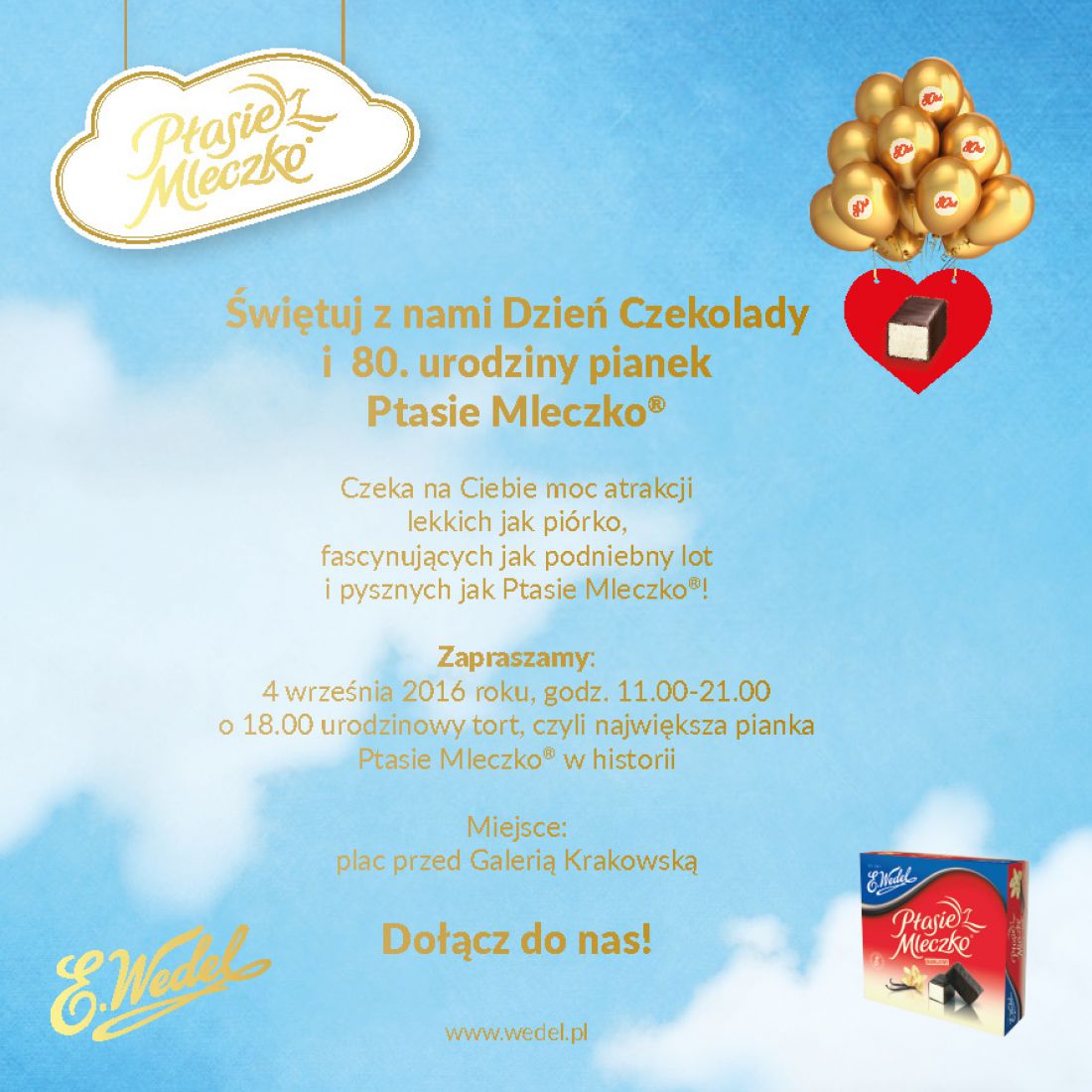 Już w najbliższš niedzielę 4 wrzenia będziemy obchodzić Międzynarodowy Dzień Czekolady, a także 80. urodziny kultowych pianek Ptasie MleczkoŽ. Z tej okazji marka E.Wedel zaprasza mieszkańców Krakowa do wspólnego więtowania. Na wszystkich uczestników czeka szereg atrakcji, m.in. skok w olbrzymie pudełko pianek Ptasie MleczkoŽ, fontanna czekoladowa, mnóstwo konkursów, a także