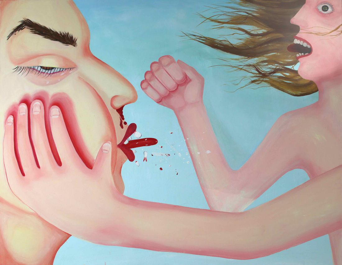 Schodzšc schodkami w dół trafiamy do mniejszej sali, w której znajdujš się obrazy. W wiecie tych płócien nie ma wiatłocienia i perspektywy. Figury ludzkie sš płaskie i uproszczone. Majš wielkie dłonie, niezgrabne stopy i twarze przypominajšce maski zastygłe w znaczšcym grymasie. Wyrazy twarzy i gesty sš jednoznaczne. Podobnie otoczenie. Znaczenia poszczególnych scen definiowane sš dosadnie. Przestrzeń pomieszczenia zamykajš dwa duże płótna - wyobrażenia walki i libacji. Bardzo klasyczne motywy: wojna i zabawa. Te podstawowe społeczne rytuały mieszajš się z alegoriami emocji: strachu, smutku, gniewu i radoci. Jednak Jabłońska płata okrutne żarty swoim bohaterom. Na grzbiecie bestii siedzi domowy kot. Płaczšcej kobiecie wesoła żółć parasola odbiera prawo do współczucia. Orgiastyczna scena z lwem jest raczej senna i leniwa. Z uderzonej pięciš twarzy wypada rój pięknych, owadzich zębów. Jednš z głównych bohaterek obrazów Jabłońskiej jest ona sama, a właciwie jej uproszczony wizerunek, z charakterystycznymi długimi brwiami, szerokš twarzš i zaczesanymi do tyłu włosami. Jednak nie sposób wyczuć, czy jej obrazy oparte sš na osobistych przeżyciach, czy traktuje swój wizerunek jako kolejnš postać swoich opowieci. Tym bardziej, że obrazy te, przez przyjętš konwencję stylistycznš umownoć form i przestrzeni, bezczasowoć i bezcielesnoć, tworzš bezpieczny dystans. Nie współczujemy i nie boimy się naprawdę. Oglšdamy przedstawione przez Jabłońskš emocje tak, jakbymy oglšdali przyszpilone w gablotach motyle.