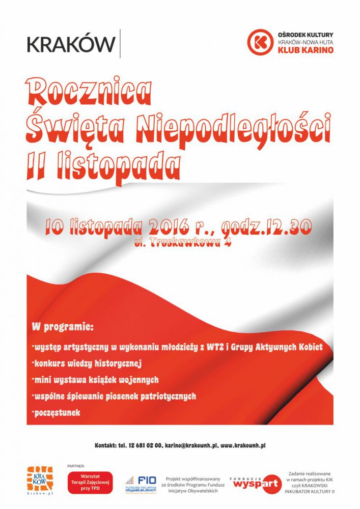 W ramach projektu Krakowski Inkubator Kultury II Klub Karino Oœrodka Kultury Kraków-Nowa Huta (ul. Truskawkowa 4) zaprasza 10 listopada o godz. 12.30 na spotkanie upamiętniajšce odzyskanie przez Polskę Niepodległoœci – Œwięto 11 listopada. W wydarzenie zaangażowana została społecznoœć lokalna osiedla Chałupki, Młodzież niepełnosprawna WTZ oraz seniorki i grupa Aktywne Kobiety działajšce przy Klubie Karino, które wystšpiš podczas imprezy z programem okolicznoœciowym. Będzie również goœć specjalny, który przybliży wszystkim zebranym wydarzenia z tamtego okresu. Odbędzie się konkurs wiedzy historycznej, mini wystawa ksišżek o tematyce wojennej oraz wspólne œpiewanie pieœni patriotycznych. Projekt współfinansowany ze œrodków Programu Fundusz Inicjatyw Obywatelskich.