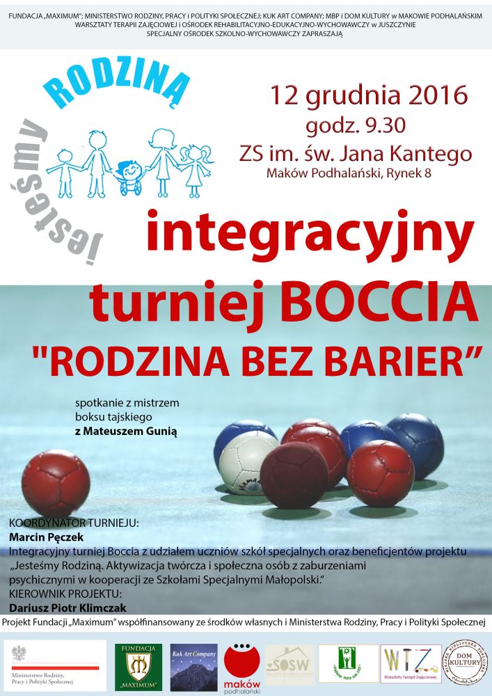 Integracyjny Turniej "BOCCIA" pod hasłem "Rodzina bez barier" realizowany jest w ramach projektu Fundacji "Maximum": "JESTEŒMY RODZINĽ". Aktywizacja twórcza i społeczna osób z zaburzeniami.