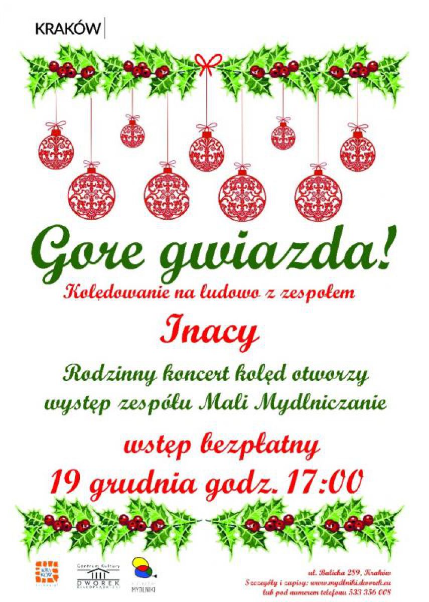 Pokolędujmy razem przy dŸwiękach muzyki na żywo, którš przyniesie nam w prezencie zespół Inacy! Przed gwiazdš wieczoru wystšpi coraz jaœniej nam œwiecšca gwiazda- czyli zespół Mali Mydlniczanie! Zapraszamy rodziny z dziećmi, sšsiadów, przechodniów, obserwatorów, miłoœników folkloru- wszystkich!.