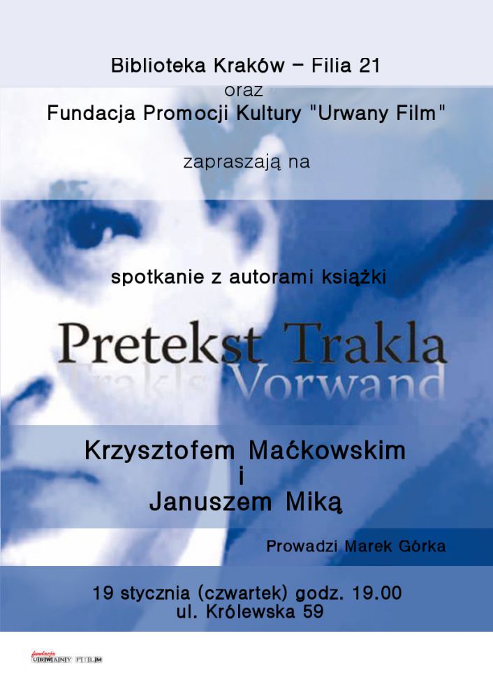 Biblioteka Kraków filia 21 i Fundacja Promocji Kultury „Urwany Film” zapraszaj¹ na spotkanie z autorami ksi¹æki „Pretekst Trakla. Trakls Vorwand” Krzysztofem Maękowskim i Januszem Mik¹.