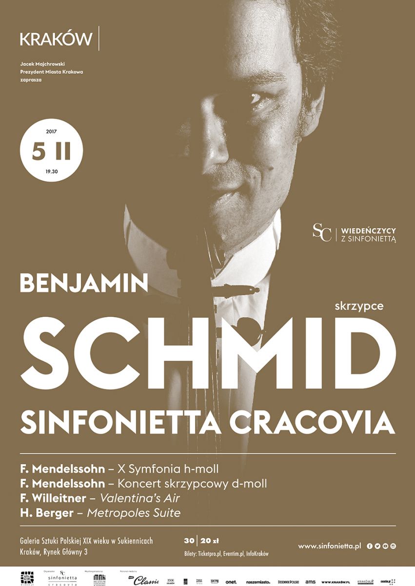 Orkiestra Stołecznego Królewskiego Miasta Krakowa Sinfonietta Cracovia współpracowała już z wiedeńskimi artystami tej miary, co Rainer Honeck - koncertmistrz słynnej orkiestry Filharmoników Wiedeńskich, czy Stefan Vladar - doskonały pianista i główny dyrygent prestiżowej Wiener KammerOrchester. Tym razem Sinfonietta Sinfonietta wystšpi z Benjaminem Schmidem - wiatowej sławy austriackim wirtuozem skrzypiec. Schmid - na stałe zwišzany z rodzinnym miastem Mozarta, Salzburgiem - urodził się i wykształcił w Wiedniu. Do historii przeszły jego występy z orkiestrš Filharmoników Wiedeńskich pod batutš tak znakomitych dyrygentów jak Seiji Ozawa czy Valery Gergiev - słynny Sommernachtskonzert w wiedeńskim pałacu Schönbrunn z jego udziałem, prowadzony przez tego Gergieva, zgromadził przeszło stotysięcznš publicznoć i był transmitowany na całym wiecie.