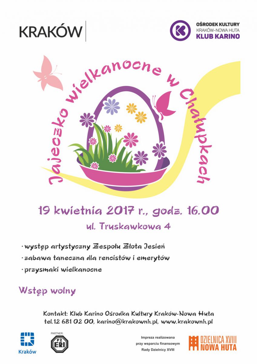 Jajeczko Wielkanocne w Chałupkach to jedna z imprez okolicznoœciowych organizowana dla emerytów i rencistów zrzeszonych w PZERiI. Impreza ta corocznie organizowana jest w innym klubie Oœrodka Kultury Kraków – Nowa Huta. Tym razem gospodarzem Jajeczka Wielkanocnego będzie Klub Karino. Program artystyczny wykona goœcinnie Zespół Złota Jesień. Impreza realizowana przy wsparciu finansowym Rady Dzielnicy XVIII.