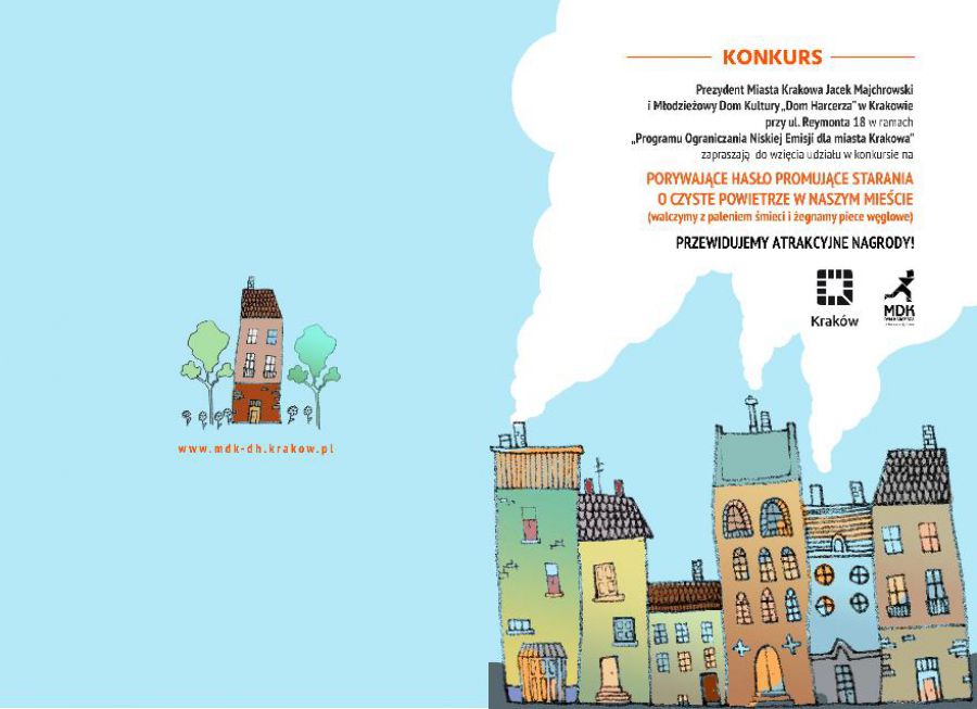 Zapraszamy do udziau w konkursie na porywajce haso promujce starania o czyste powietrze w naszym miecie walczymy z paleniem mieci i egnamy piece wglowe! Udzia w konkursie mog wzi osoby w wieku od 7 do 19 lat, mieszkajce lub uczce si na terenie Gminy Miejskiej Krakw. Prace mog by tworzone indywidualnie lub w zespole.