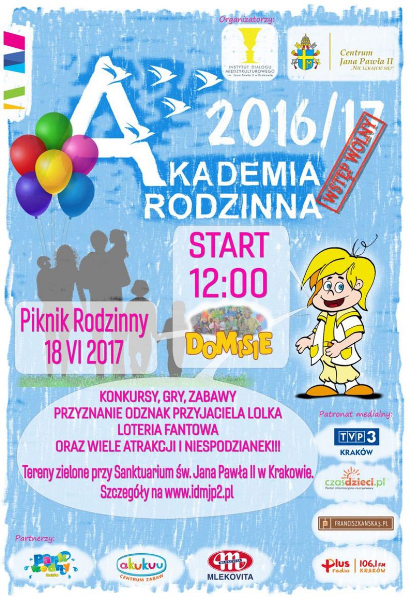 Instytut Dialogu Międzykulturowego im. Jana Pawła II w Krakowie oraz Centrum Jana Pawła II - "Nie lękajcie się!" w Krakowie serdecznie zapraszajš dzieci oraz rodziców na Piknik Rodzinny, który odbędzie się w niedzielę, 18 czerwca 2017 roku o godz. 12:00, na terenach zielonych przy Sanktuarium w. Jana Pawła II w Krakowie. Będzie to ostatnie spotkanie w ramach Akademii Rodzinnej w tym roku szkolnym.
