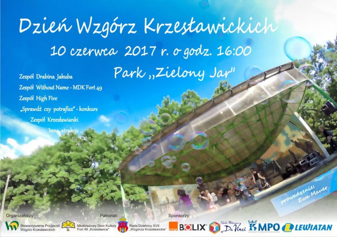 W najbliższš sobotę, 10 czerwca 2017 o godz. 16:00 w parku "Zielony Jar" obędzie się festyn pn. "Dzień Wzgórz Krzesławickich. Wydarzenie organizowane jest pod honorowym patronatem Rady Dzielnicy XVII - Wzgórza Krzesławickie przy współpracy MDK Fort 49 "Krzesławice" i