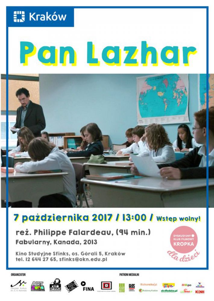 Dyskusyjny Klub Filmowy Kropka dla dzieci i ARTzona zapraszajš 7 padziernika o godz.13.00 na film Pan Lazhar w reż. Philippe Falardeau. A po filmie wszystkie dzieci zapraszamy na dyskusję, podczas której każdy maluch stanie się krytykiem filmowym.