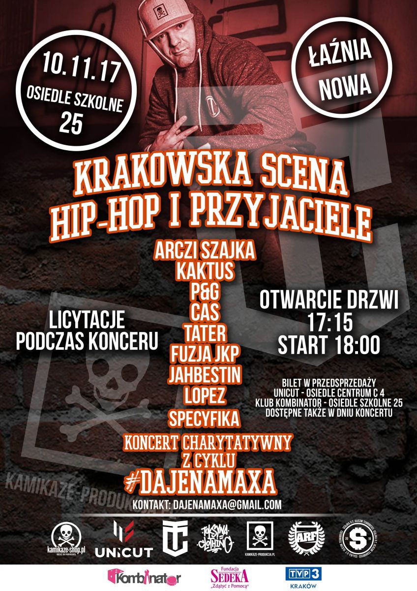 Goršco zapraszamy na charytatywny hiphopowy koncert, który odbędzie się 10.11.2017r. w Teatrze Łania Nowa. Miejsce i artyci nie sš przypadkowi, bo jak wiadomo Max wychował się w Hucie. Szykujemy wiele niespodzianek. Podczas koncertu odbędš się również licytacje. Będziecie też mogli kupić koszulki #DAJENAMAXA. Cała zebrana kwota zostanie przeznaczona na leczenie Maxa (przeszczep komórek macierzystych).. Max ma szanse stanšć na nogi. Artyci grajš charytatywnie, bo każdy z nich #DAJENAMAXA. Wiemy także, że każdy z Was też #DAJENAMAXA, więc nie będziemy biletować wstępu. Żeby bawić się z nami wystarczy wesprzeć Maxa kwotš nie mniejszš niż 25PLN wpłacajšc na konto 67 1140 2004 0000 3902 4269 8924 w tytule podajšc swoje imię i nazwisko/KONCERT, a my wpiszemy Was na listę. Jeli zdecydujecie się przyjć dopiero w dniu koncertu, nie zapomnijcie włożyć przynajmniej 30 PLN do puszki, która będzie stała przy wejciu.
