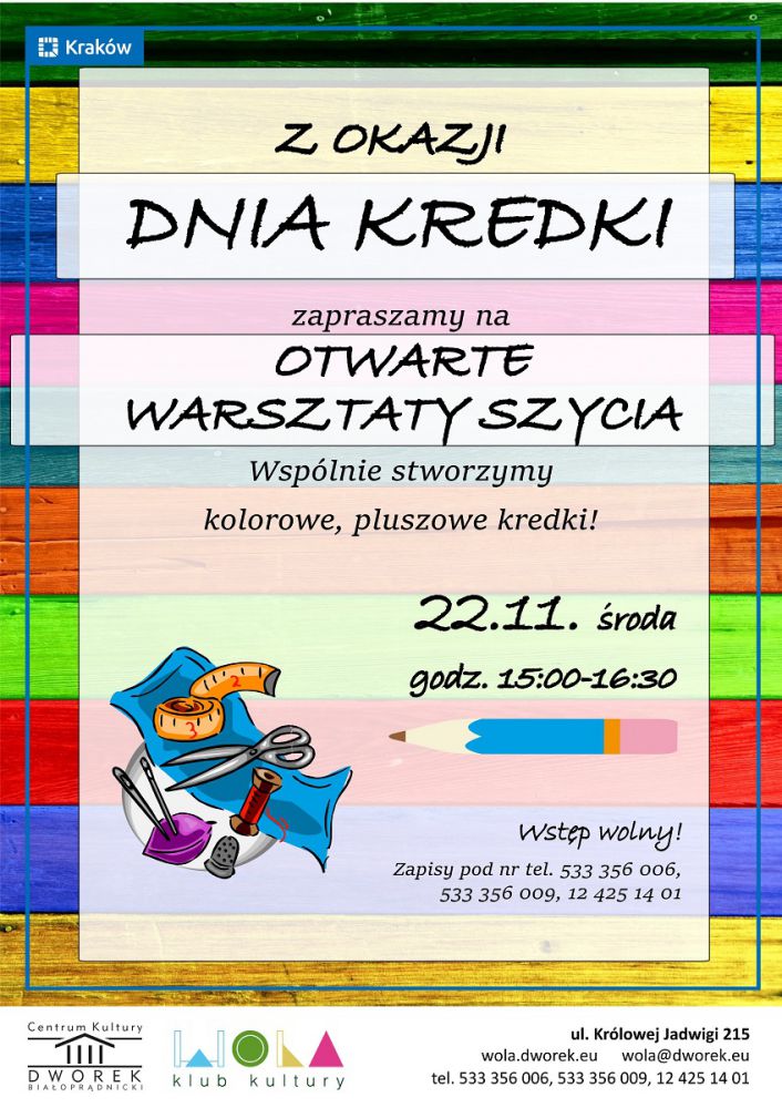 Z tej okazji Klub Kultury Wola (ul. Królowej Jadwigi 215) zaprasza na otwarte warsztaty szycia. Wspólnie stworzymy kolorowe, jedyne w swoim rodzaju, pluszowe kredki.