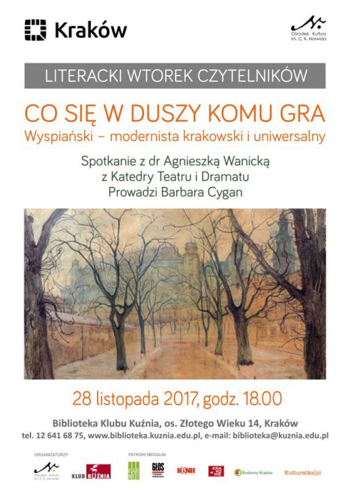 Wtorek literacki poœwięcony Stanisławowi Wyspiańskiemu i jego wpływie na polskš sztukę, kulturę i historię. Spotkanie z dr Agnieszkš Wanickš z Katedry Teatru i Dramatu UJ. Wstęp wolny.