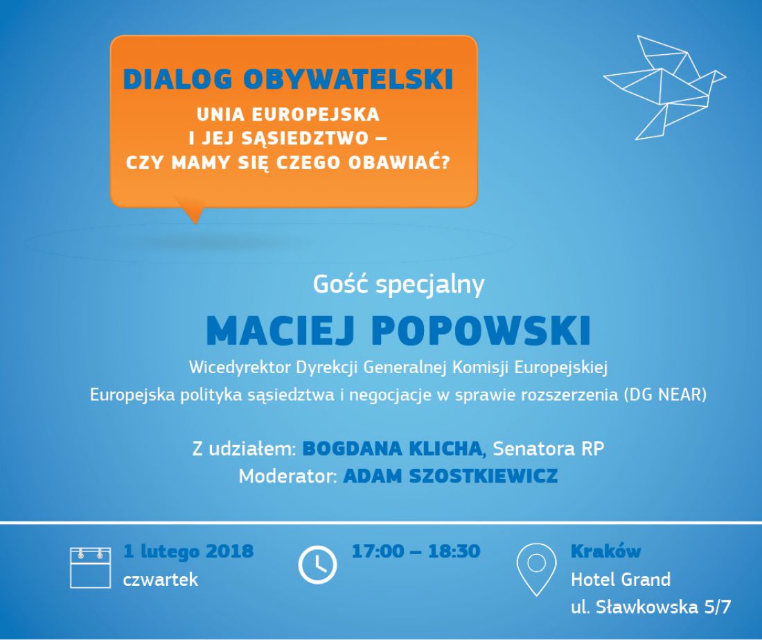 Instytut Studiów Strategicznych wspólnie z Przedstawicielstwem Komisji Europejskiej w Polsce zaprasza w dniu 1 lutego 2018 w godz. 17:00-18:30 na Dialog Obywatelski "Unia europejska i jej sšsiedztwo – czy mamy się czego obawiać?" (debatę publicznš) z