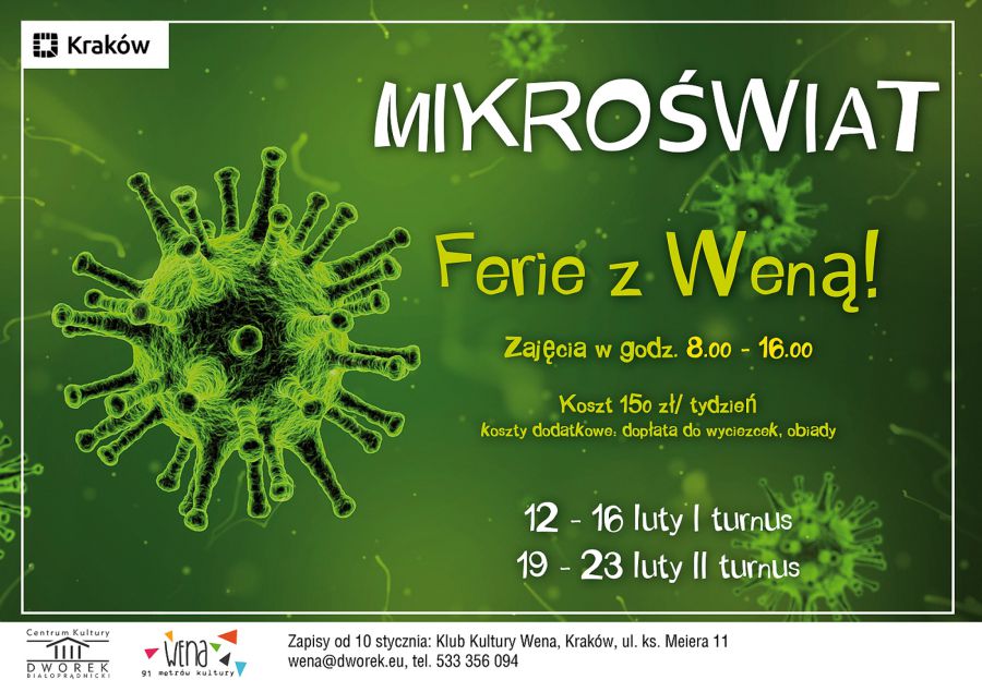 Trwajš zapisy na warsztaty kulturalne w Wenie. Temat przewodni to Mikroœwiat. Czy wirek to mały wir? Co niesamowitego potrafi niesporczak? Czy pleœń może być pożyteczna? A czy pajški sš tak straszne jak się wydaje? Zapraszamy na dwa tygodnie pełne wrażeń! Dwie niezapomniane wycieczki i ciekawe warsztaty oraz spotkania. Na pewno nikt nie będzie się z nami nudził! Szczegółowy program na naszej stronie wena.dworek.eu! Termin: 12-16 lutego (zostały dwa miejsca) i 19-23 lutego (zostało 6 miejsc). Godziny: 8:00 do 16:00 Wiek uczestników: 6-12 lat Koszt: 150zł/tydzień. Koszty dodatkowe: możliwoœć wykupienia obiadów, dopłata do wycieczek.