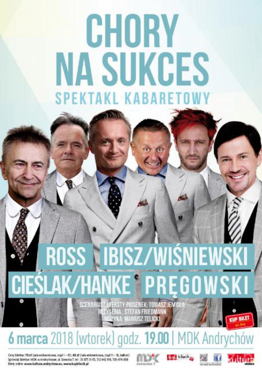 Tego jeszcze nie było! Teatr, kabaret i koncert w jednym! Spektakl kabaretowy Chory na Sukces jest zabawnš próbš ukazania postaci celebryty, którego podczas występu w Andrychowie zagra Michał Winiewski. Artysta, chcšc wyjć naprzeciw plotkom i próbom omieszenia jego osoby, tworzy na scenie postać zarozumiałego i przekonanego o swej wielkoci bufona, po to by dać dowód na posiadany do siebie dystans i zdyskontować to, co się o Nim niesłusznie mówi.