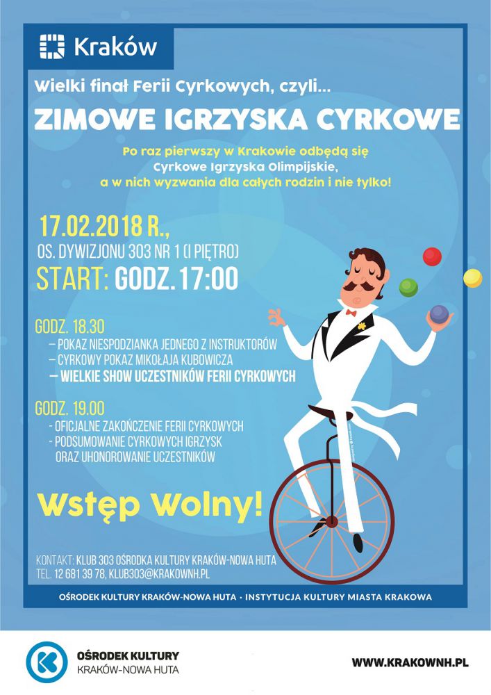 W tegorocznej ofercie Klubu 303 Orodka Kultury Kraków-Nowa Huta na zimowš przerwę w nauce znalazły się Cyrkowe Ferie. Podczas tygodniowych warsztatów dzieci będš doskonalić swoje umiejętnoci i zdobywać nowe sprawnoci w zakresie akrobatyki, żonglerki, balansu, klaunady, jazdy na monocyklach i chodzenia na szczudłach. W ramach finału pierwszych Cyrkowych Ferii, w sobotę 17 lutego o godz. 17.00, Klub 303 (os. Dywizjonu 303 nr 1) zaprasza na otwarte wydarzenie dla całych rodzin - Zimowe Igrzyska Cyrkowe.
