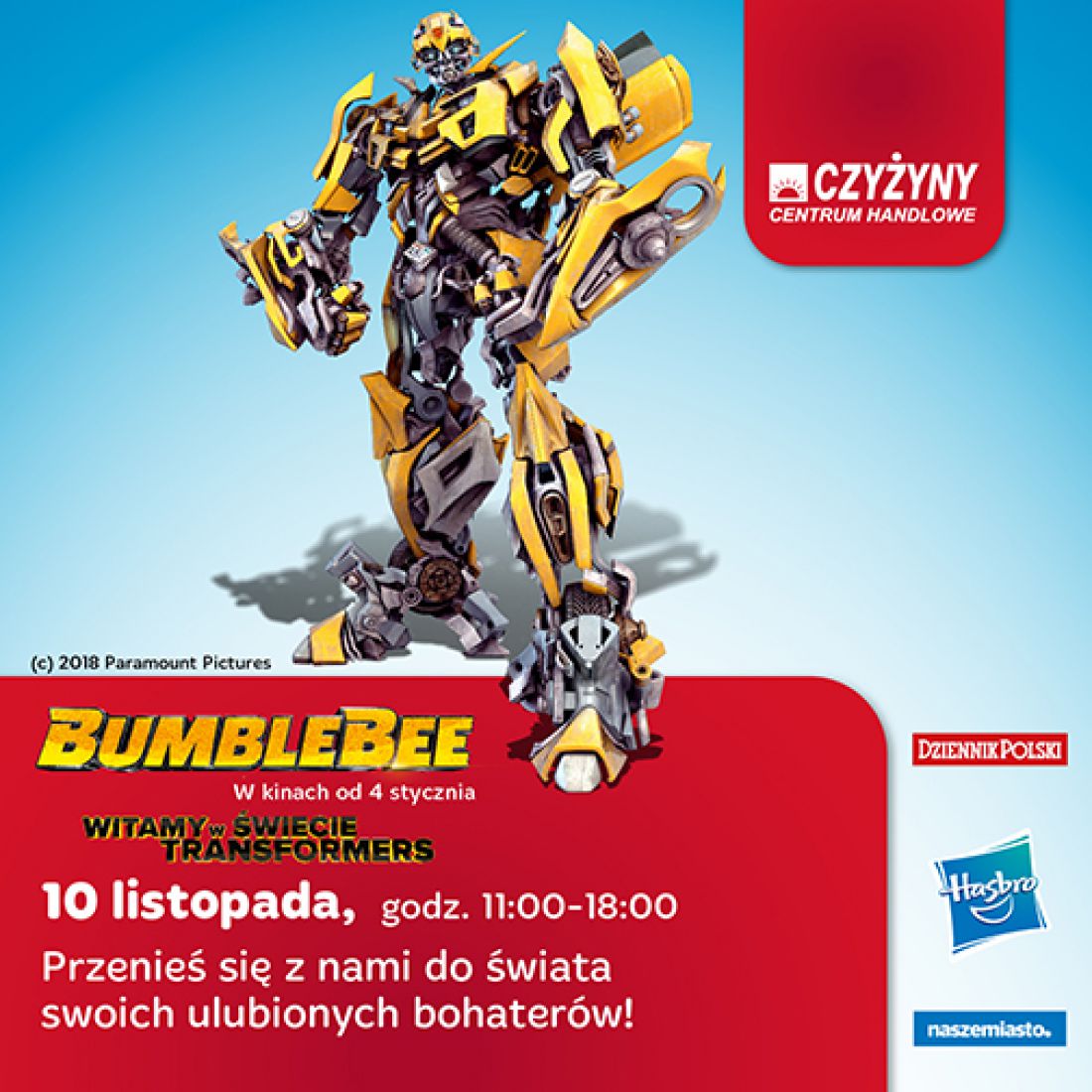 Już w sobotę, 10 listopada, wszyscy wielbiciele Bumblebee będš mogli spotkać swojego ulubionego bohatera w Centrum Handlowym Czyżyny! W godzinach od 11.00 do 18.00 CH Czyżyny zamieni się w œwiat pełen Transformers, w którym czekać będzie wiele atrakcji. „Bumblebee. Witajcie w œwiecie Transformers!” to wydarzenie promujšce nowy film Travisa Knighta, który na ekranach polskich kin zobaczymy już 4 stycznia 2019 roku.