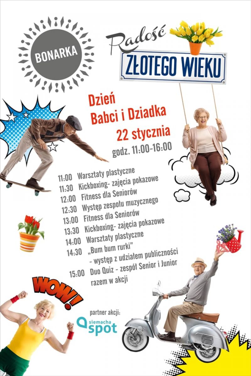 Z okazji Dnia Babci i Dziadka 22 stycznia o godz. 11:00 w Bonarce odbędzie się zabawa dla juniorów i seniorów. Na jej uczestników będzie czekało mnóstwo atrakcji m.in.: trening z mistrzem œwiata w kickboxingu, zajęcia fitness, koncert muzyczny oraz warsztaty plastyczne. Wydarzenie ma charakter proedukacyjny, zachęca do wymiany doœwiadczeń między pokoleniami, ruchu i kreatywnoœci.