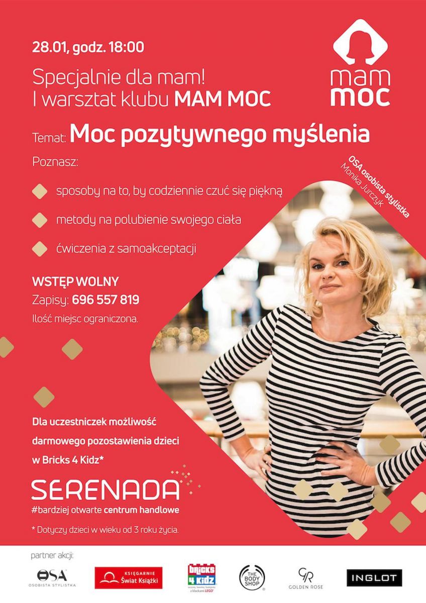 Już 28 stycznia w Centrum Serenada odbędš się warsztaty pod hasłem Moc pozytywnego myœlenia, pierwsze z cyklu klubu MAM MOC. Poprowadzi je osobista stylistka Monika Jurczyk, znana również jako OSA. Nie zabraknie kobiecej solidarnoœci, motywacji i pracy nad samoakceptacjš. Startujemy już o 18.00.