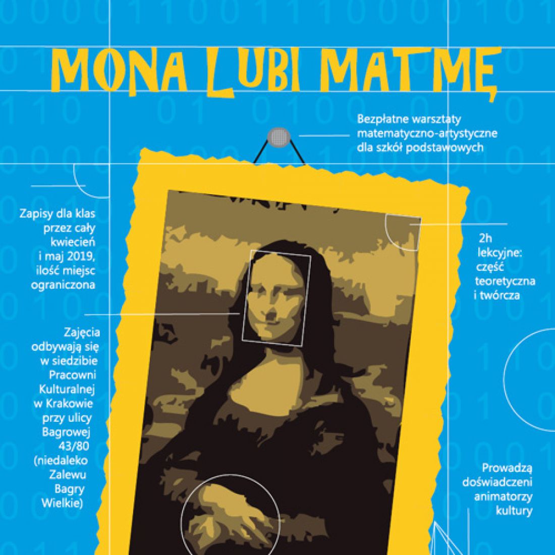 Bezpłatne zajęcia matematyczno-artystyczne dla klas szkół podstawowych.Mona lubi matmę, to nowy projekt, który łšczy dwie pozornie odległe dziedziny jakimi sš matematyka i sztuka. Jego celem jest przybliżenie zagadnień i pojęć matematycznych poprzez ukazanie ich zastosowania w malarstwie, rzebie i architekturze.