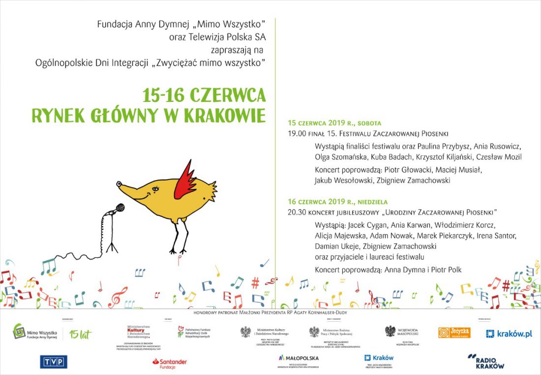 Już 15 czerwca na Rynku Głównym w Krakowie odbędzie się finał 15. Festiwalu Zaczarowanej Piosenki. 12 utalentowanych niepełnosprawnych wokalistów wystšpi na jednej scenie z gwiazdami polskiej branży muzycznej: Kubš Badachem, Krzysztofem Kiliańskim, Czesławem Mozilem, Paulinš Przybysz, Aniš Rusowicz, Olgš Szomańskš.