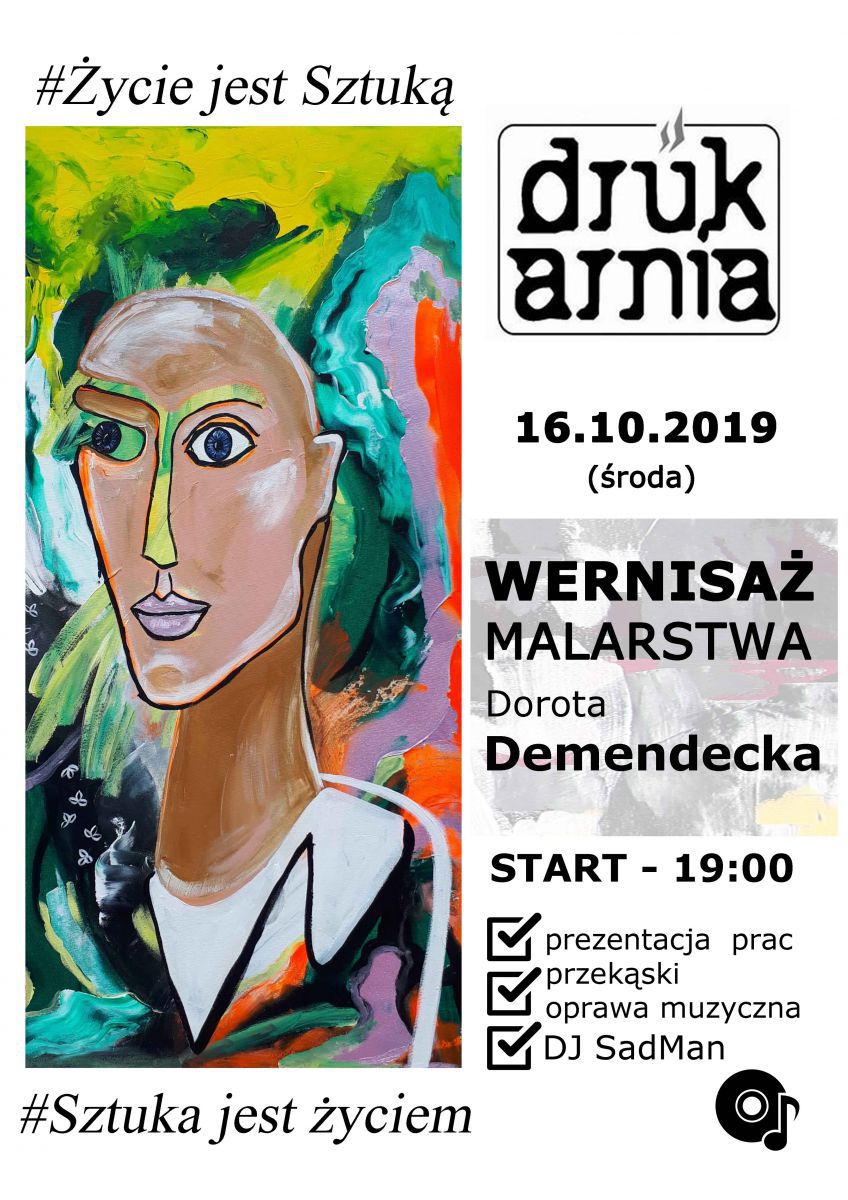 Z ogromnš przyjemnoœciš informuję Państwa o wernisażu malarstwa krakowskiej artystki Doroty Demendeckiej,który odbędzie się 16 paŸdziernika o godzinie 19tej w Klubie Drukarnia na ulicy, Nadwiœlańskiej 1.