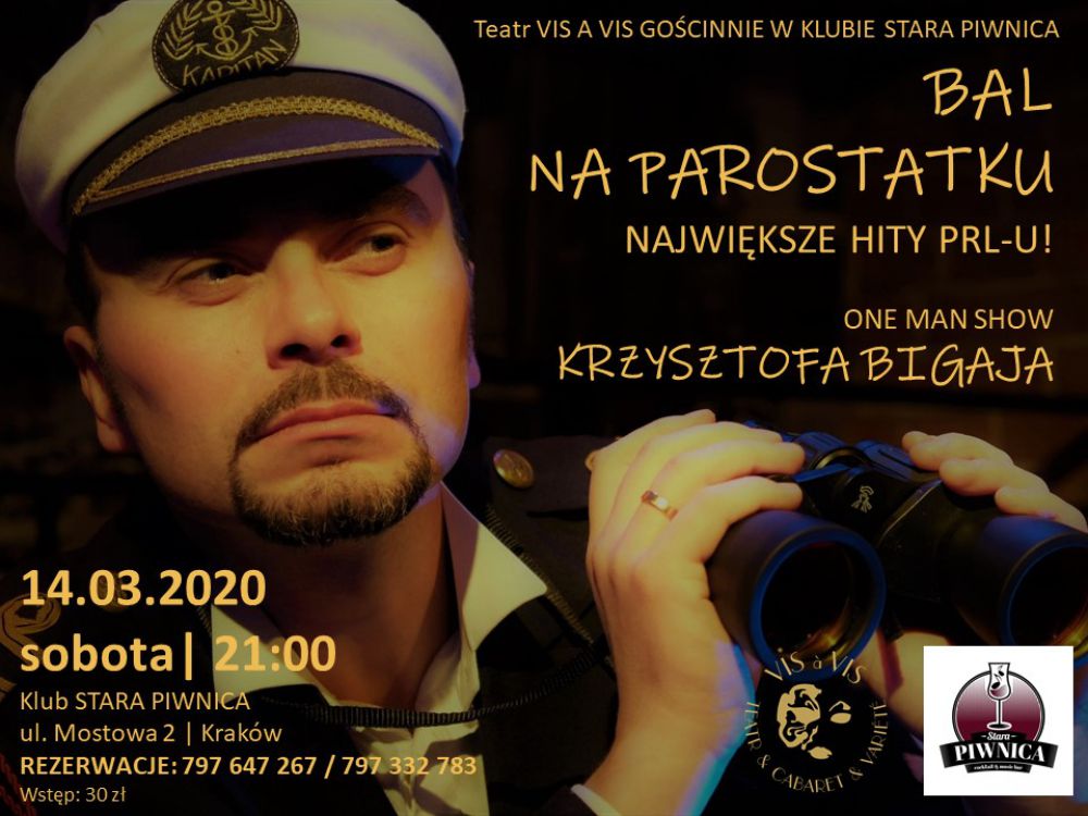Pieszo, autostopem, a może pocišgiem byle jakim? Jeœli chcecie Państwo połšczyć podróż w czasie z dobrš zabawš, to tylko podczas rejsu parostatkiem i jedynie z rozœpiewanym kapitanem, który z muzyki lat ‘60 i ‘70 wyłowi dla Was bezcenne perły - przypomni melodyjne hity towarzyszšce licznym zabawom minionych lat, jednoczeœnie niebanalne teksty, piosenki melancholijne i emocjonalne. Zapraszamy na karnawałowy „BAL NA PAROSTATKU” – pełnš humoru oraz interakcji muzyczno-sytuacyjnš prywatkę.