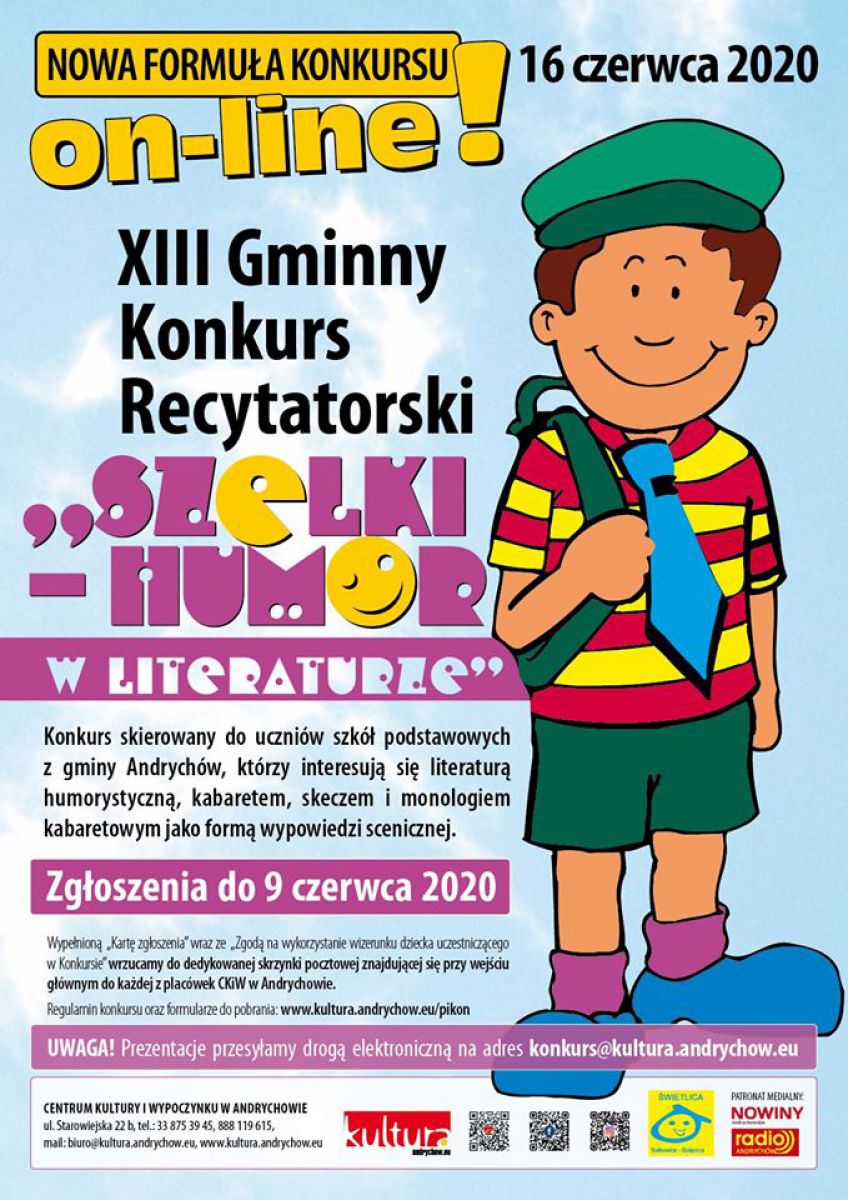 W czasach pandemii koronawirusa nie można organizować konkursów stacjonarnie. Centrum Kultury i Wypoczynku w Andrychowie podjęło decyzję, by ten konkurs, cyklicznie odbywajšcy się w naszej gminie, przeprowadzić w wersji on-line. Serdecznie zapraszamy dzieci i młodzież do udziału w XIII edycji Gminnego Konkursu Recytatorskiego SZELKI HUMOR W LITERATURZE w nowej formie! ❗❗❗Zgłoszenia przyjmowane sš do 9 czerwca 2020 r.