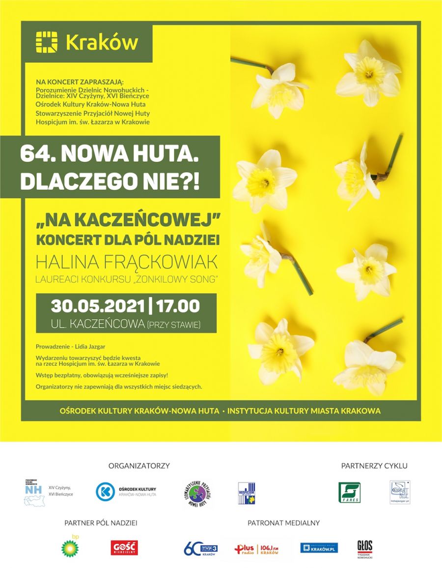 Halina Fršckowiak oraz laureaci konkursu piosenki „Żonkilowy Song” wystšpiš podczas pierwszego w 2021 roku koncertu z cyklu Nowa Huta. Dlaczego Nie?!, dedykowanego Polom Nadziei. Koncert odbędzie się 30 maja 2021 o godz. 17.00 w plenerowej scenerii – nad stawem przy ul. Kaczeńcowej, w Dzielnicy XVI Bieńczyce.