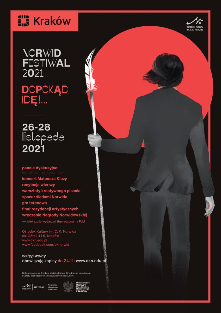 Norwid Festiwal 2021 krakowska odsłona obchodów Roku C. K. Norwida z okazji 200-lecia jego urodzin pod hasłem Dopokšd idę!.... Projekt popularyzuje postać i twórczoć Norwida jednego z najważniejszych autorów w literaturze polskiej. Jego dzieła stereotypowo postrzegane sš jako trudne w odbiorze. Dzięki innowacyjnym i atrakcyjnym działaniom edukacyjnym odwołujšcym się do kultury współczesnej oraz angażujšcym różnorodnych odbiorców, przedsięwzięcie umożliwia nowe spojrzenie na kanon polskiej literatury, rozbudza zainteresowanie nim oraz wzmacnia tożsamoć uczestników, podnoszšc ich kompetencje czytelnicze. W programie przewidziano rezydencje artystyczne, przyznanie Nagrody Norwidowskiej dla twórców łšczšcych działalnoć literackš z innymi dziedzinami sztuki, a także panele dyskusyjne, recytację, koncert, warsztaty kreatywnego pisania, spacer, grę terenowš. Rezultaty podsumuje wydanie katalogu.