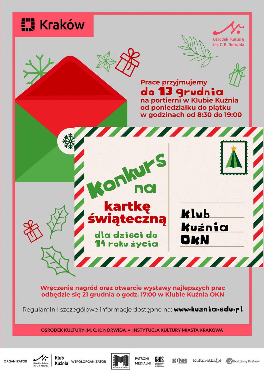 Zapraszamy do udziału w konkursie plastycznym na najpiękniejszš kartkę wištecznš dzieci do 14 roku życia. Prace można składać na portierni w Klubie Kunia od poniedziałku do pištku w godzinach od 8:30 do 19:00 do 13 XII.