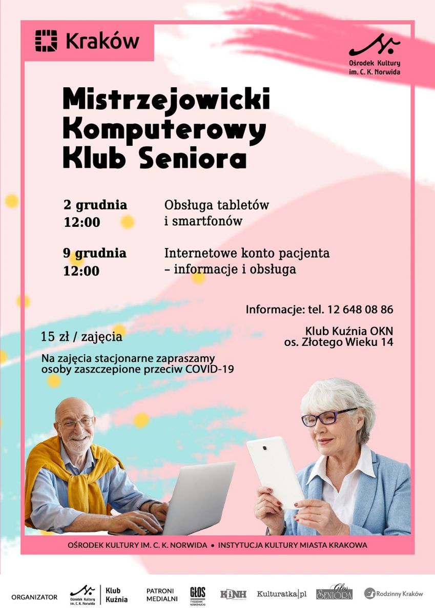 Mistrzejowicki Komputerowy Klub Seniora zaprasza na spotkania w Klubie Kunia OKN, os. Złotego Wieku 14 w Krakowie.