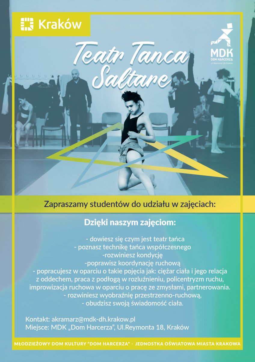Jeśli lubisz się ruszać, ale zajęcia taneczne to dla Ciebie za mało- zapraszamy do pracowni Teatru Tańca „Saltare”! Tutaj rozwiniesz swoją wyobraźnię i potencjał artystyczny.