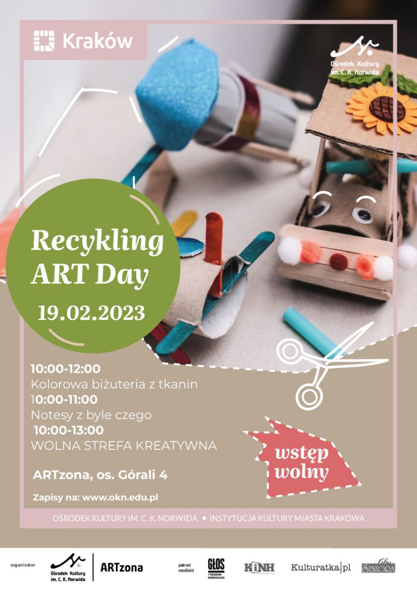 Recykling ART Day to kreatywna propozycja zachęcająca do ponownego wykorzystania śmieci i tworzenia z nich przedmiotów użytkowych, ozdób, narzędzi do nauki i rozwoju. W myśl zasady „najpierw wykorzystuj to, co masz” zaprosimy uczestników do przetwarzania resztek tkanin, papieru czy plastiku, by zrobić oryginalne przedmioty, biżuterię, zabawki i przyrządy, które mogą służyć ponownie, a co za tym idzie, ograniczać produkcję odpadów w życiu codziennym.