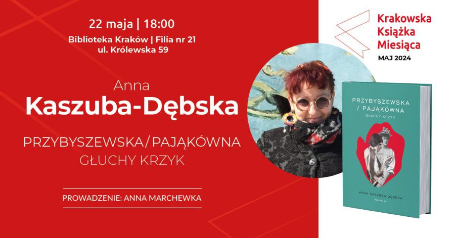 Biblioteka Kraków zaprasza w środę 22 maja 2024 r. o godz. 18.00 na spotkanie z Anną Kaszubą-Dębską – laureatką nagrody Krakowska Książka Miesiąca – i wręczenie nagrody za książkę „Przybyszewska / Pająkówna. Głuchy krzyk” będącą biografią pisarki Stanisławy Przybyszewskiej i jej matki – malarki Anieli Pająkówny.