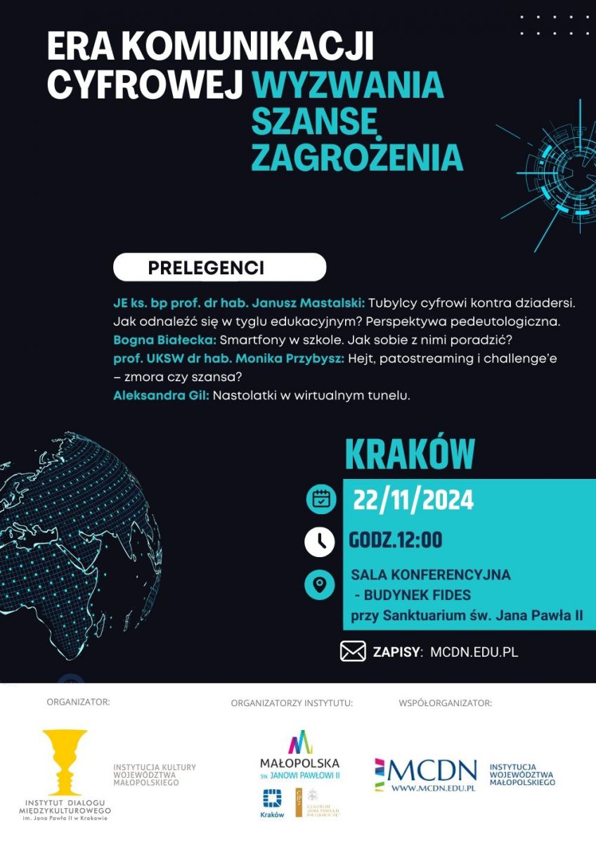 Instytut Dialogu Międzykulturowego im. Jana Pawła II w Krakowie oraz Małopolskie Centrum Doskonalenia Nauczycieli zapraszają 22 listopada 2024 o godz. 12.00 na konferencję dla nauczycieli i wychowawców ,,Era komunikacji cyfrowej – wyzwania, szanse, zagrożenia”.