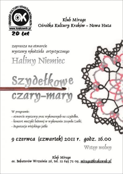 Klub Mirage Oœrodka Kultury Kraków – Nowa Huta (os. Bohaterów Wrzeœnia 26) zaprasza 9 maja (czwartek) 2011 r. o godz. 16.00 na otwarcie wystawy prac Haliny Niemiec wykonanych na szydełku.