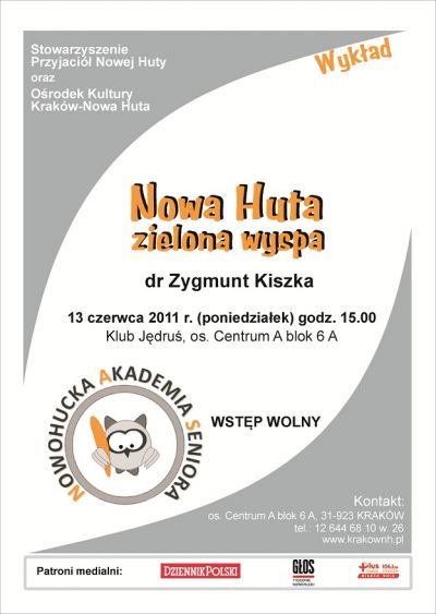 Wykład odbędzie się 13 czerwca (poniedziałek) 2011 r. o godz. 15.00 na os. Centrum A bl. 6a w ramach Nowohuckiej Akademii Seniora.