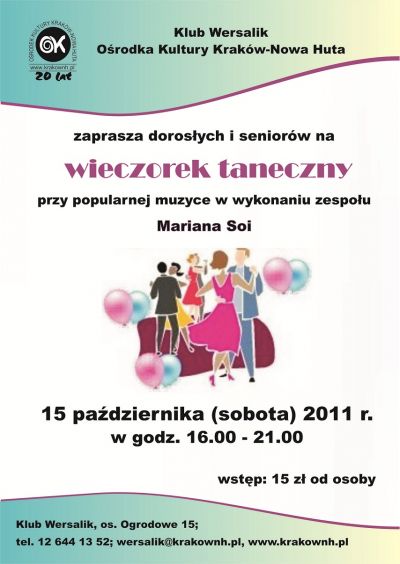 Klub Wersalik Orodka Kultury Krakw Nowa Huta (os. Ogrodowe 15) zaprasza 15 padziernika (sobota) 2011 r. w godz. 16.00 21.00 na imprez taneczn dla dorosych i seniorw przy popularnej muzyce w wykonaniu zespou Mariana Soi.