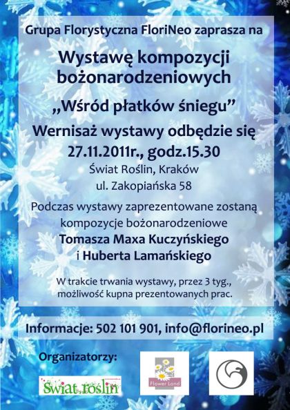 Zaproszenie na wernisaż wystawy, prac bożonarodzeniowych, którš organizuje Grupa Florystyczna FloriNeo, sklep wiat Rolin, Pracownia Florystyczna Flower Land Hubert Lamański, Agencja Florystyczna Tomasza Maxa Kuczyńskiego