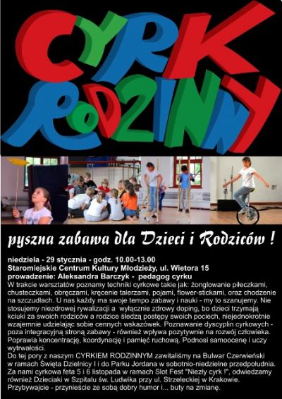 Do tej pory z naszym CYRKIEM RODZINNYM zawitaliœmy na Bulwar Czerwieński w ramach Œwięta Dzielnicy I i do Parku Jordana w sobotnio-niedzielne przedpołudnia. Za nami cyrkowa feta 5 i 6 listopada w ramach Slot Fest "Niezły cyrk !", odwiedzamy również Dzieciaki w Szpitalu œw. Ludwika przy ul. Strzeleckiej w Krakowie. Przybywajcie - przynieœcie ze sobš dobry humor i... buty na zmianę.
