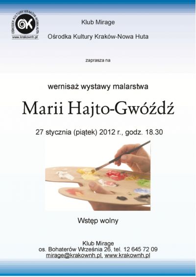 studentów Krakowskiej Akademii Muzycznej. W Klubie Mirage wczeœniej swoje prace prezentowali artyœci z Grupy Zofia Dubiel i Irena Lorenc. Wystawa czynna do 30 marca 2012 r. Galeria M Plus Klubu Mirage prezentuje prace plastyczne, fotograficzne, prace pokonkursowe dzieci oraz rękodzieło artystyczne.