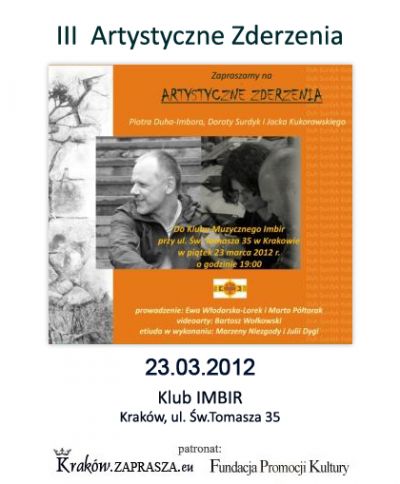 Tym razem zderzymy trzy interesujšce osobowoœci twórcze : Dorotę Surdyk i Jacka Kukorowskiego (poetów) oraz Piotra Duha – Imbora (grafika). Goœcinnie wystšpiš Marzena Niezgoda z Juliš Dyga, które zaprezentujš etiudę pantomimicznš pt. "Kolory", inspirowanš twórczoœciš Urszuli Kozioł.