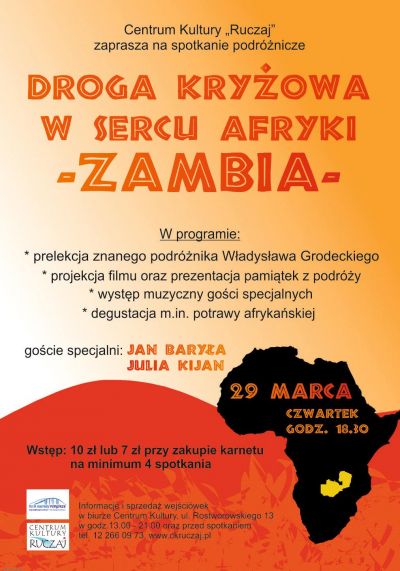 Centrum Kultury "Ruczaj" zaprasza na spotkanie podróżnicze "Droga krzyżowa w sercu Afryki - Zambia". Spotkanie odbędzie się w czwartek, 29 marca o godz. 18:30.