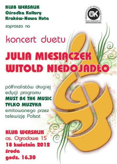 Klub Wersalik Orodka Kultury Kraków-Nowa Huta (os. Ogrodowe 15) zaprasza na koncert Julii Miesišczek i Witolda Niedojadło - półfinalistów drugiej edycji programu Must be the music. Tylko muzyka emitowanego przez telewizję Polsat.