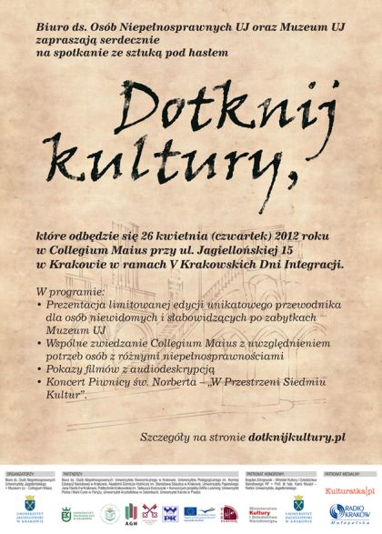 Biuro ds. Osób Niepełnosprawnych UJ oraz Muzeum UJ serdecznie zapraszajš na spotkanie ze sztukš pod hasłem Dotknij kultury, które odbędzie się 26 kwietnia (czwartek) 2012 roku w Collegium Maius przy ul. Jagiellońskiej 15 w Krakowie w ramach V Krakowskich Dni Integracji.