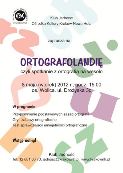 Jeżeli chcesz poznać wszystkie tajniki ortografii i zostać mistrzem w tej dziedzinie, zapraszamy do Klubu Jednoœć Oœrodka Kultury Kraków-Nowa Huta na spotkanie z ortografiš na wesoło. Impreza adresowana jest do uczniów szkół podstawowych. W programie: przypomnienie zasad pisowni oraz gry i zabawy ułatwiajšce wzrokowe zapamiętywanie, które jak wiadomo jest kluczem do sukcesu. Na najlepszych czekajš słodkie upominki.
